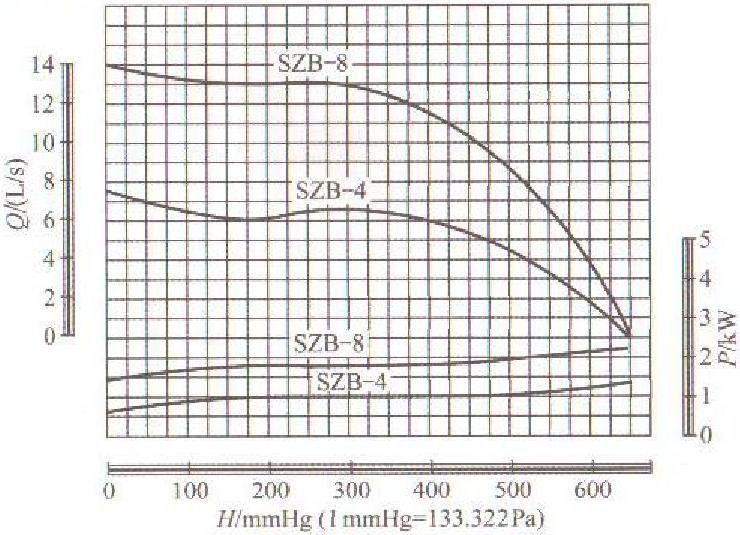 水環式真空泵有SZB型和SZ型。圖4為SZB型真空泵的性能曲線。表1為SZ型真空泵性能表。